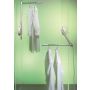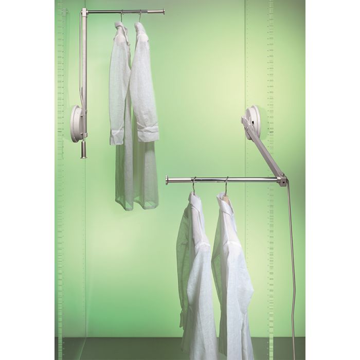 Der Lift senkt sich ab, rastet in einer Stellung zum bequemen Auf- und Abhängen der Kleidungsstücke ein und geht leicht und ruckfrei in seine Ausgangsposition zurück.
