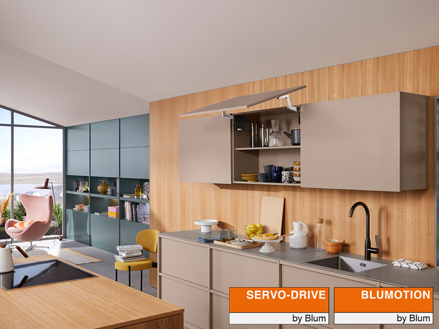 Hochschwenkbeschlag AVENTOS HS top ist ideal für große, einteilige Fronten und schwenkt diese schwerelos nach oben. Dabei bleibt genügend Platz über dem Korpus für Gestaltungselemente wie Wangen oder Kranzleisten.