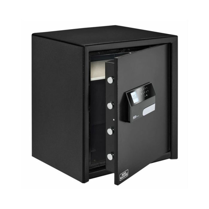 Die doppelwandige Konstruktion, ein innenliegendes Scharnier und massive 25 mm starke Rundbolzen mit zusätzlichem Schieberiegel sorgen für höchste Widerstandsfähigkeit gegen Aufbruchversuche. Eine hintergreifende Schiene an der Bandseite erhöht zusätzlich die Sicherheit. Für maximale Standfestigkeit lässt sich der Safe fest in Boden und Rückwand verankern – das passende Befestigungsmaterial ist selbstverständlich inklusive.