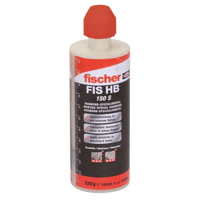 Der fischer Highbond-Spezialmörtel FIS HB 150 C ist eine Systemkomponente des fischer Highbond-Systems FHB II zur Befestigung in ungerissenem und gerissenem Beton. Die Kartusche enthält einen styrolfreien Vinylestermörtel, der mit einer handelsüblichen Dichtstoff-Auspresspistole ausgepresst werden kann. Der Spezialmörtel kann mit den fischer Highbond-Ankerstangen FHB II-A S (Standard), Highbond-Ankerstangen FHB II-A L (lang) aus galvanisch verzinktem Stahl, aus nicht rostendem Stahl und aus hochkorrosionsbeständigem Stahl verwendet werden.