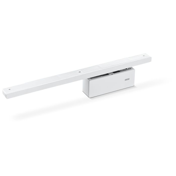 Lieferumfang: Komplettset GEZE ActiveStop, Gleitschiene mit Gleitstein und Endpuffer, Verbindungshebel, universeller Türfallenblockierer, Montagematerial, Designhauben