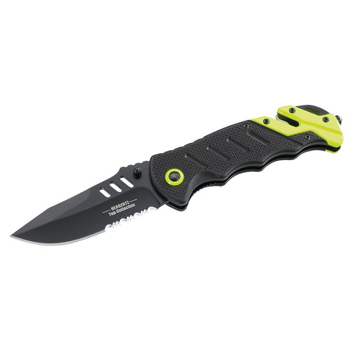 Eindrucksvoll präsentiert sich dieses kräftige Rettungsmesser aus der Herbertz TOP-Collection. Die schwarz beschichtete Droppoint-Klinge mit integrierter Teilsägezahnung ist aus rostfreiem Stahl AISI 440 gefertigt und lässt sich dank beidseitig montierter Daumenpins rasant in Arbeitsstellung schwenken. Ein Liner Lock übernimmt die zuverlässige Arretierung. Schwarze G-10 Griffschalen bilden einen harmonischen Übergang von der Klinge zum Heft und geben der Arbeitshand, in Kombination mit den ausgeprägten Fingermulden, sicheren Halt. Neonfarbige Beschläge am Griffende sowie Einsätze um die Klingenschraube herum sorgen für optische Akzente. Wenn es darauf ankommt, steht ein Gurtschneider einsatzbereit zur Verfügung. Die Lieferung erfolgt inklusive Nylon-Etui.
