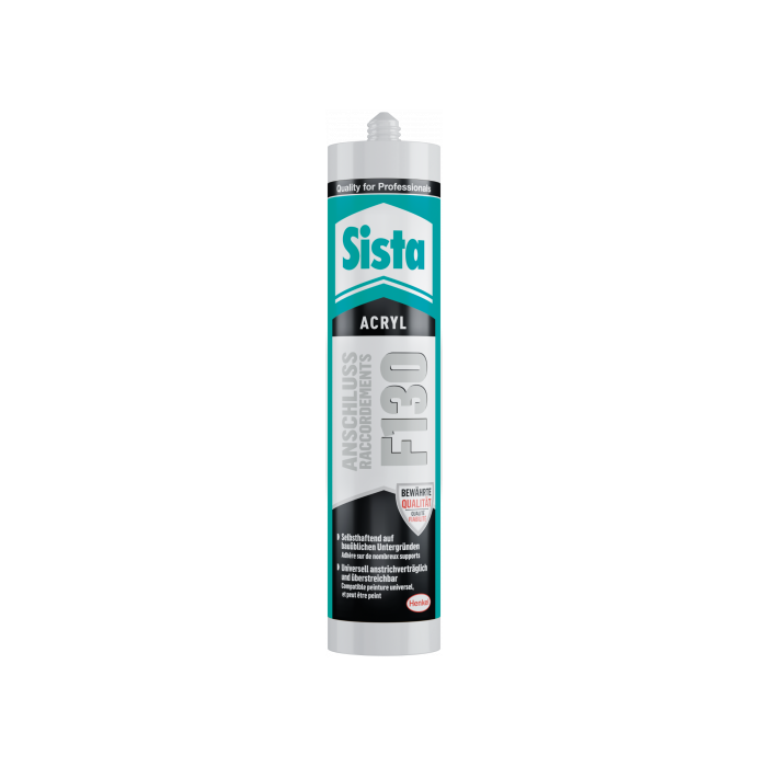 Sista F130 ist ein Acrylat-Dichtstoff für gering dehnungsbeanspruchte Anschlussfugen im Innen- und Außenbereich.